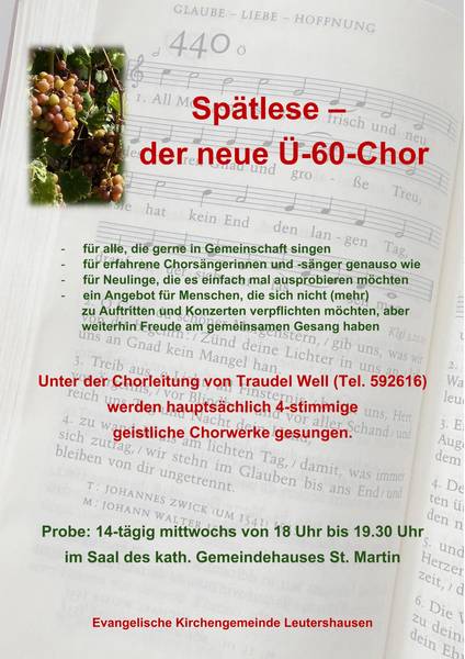 Zeit und Ort: Im 14-tägigen Rhythmus probt der Chor mittwochs von 18 Uhr bis 19.30 Uhr im Saal des kath. Gemeindehauses St. Martin in Leutershausen.