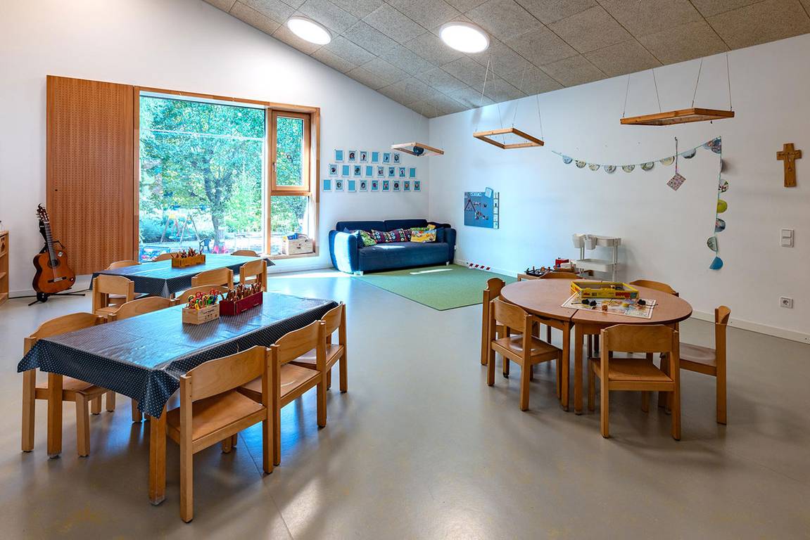 Kindergartenzimmer mit Tischen und Spielsachen